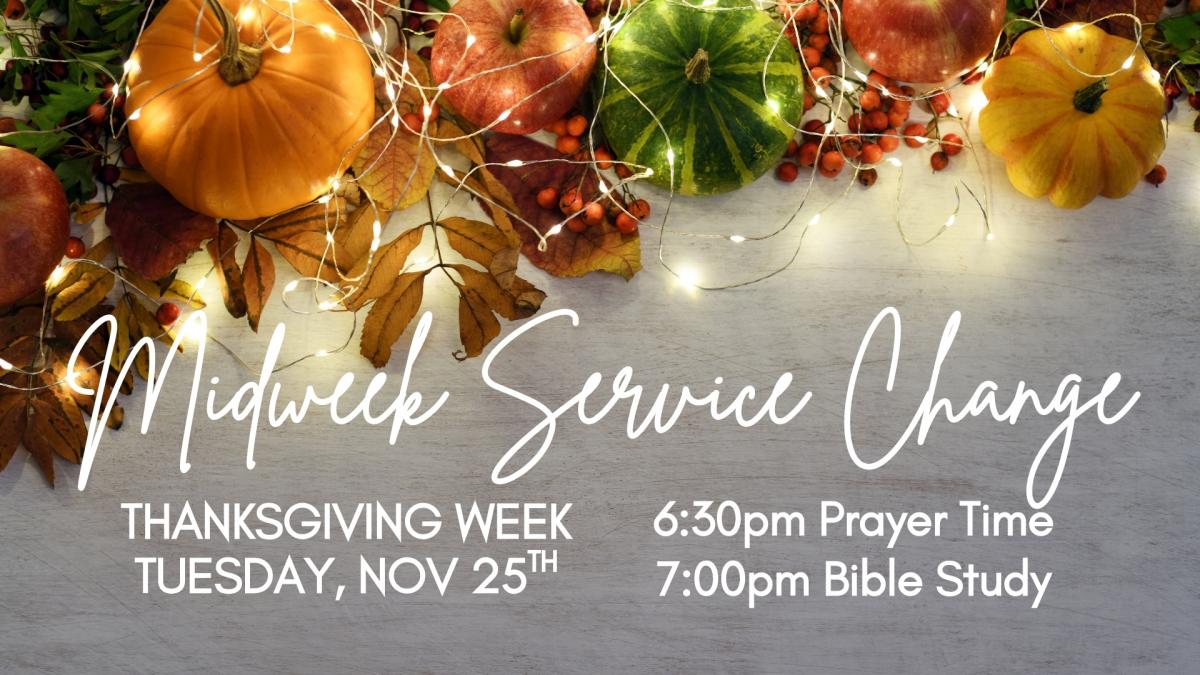 Midweek service Thanksgiving week will be on Tuesday Nov. 25th instead of Wednesday Nov. 26th.